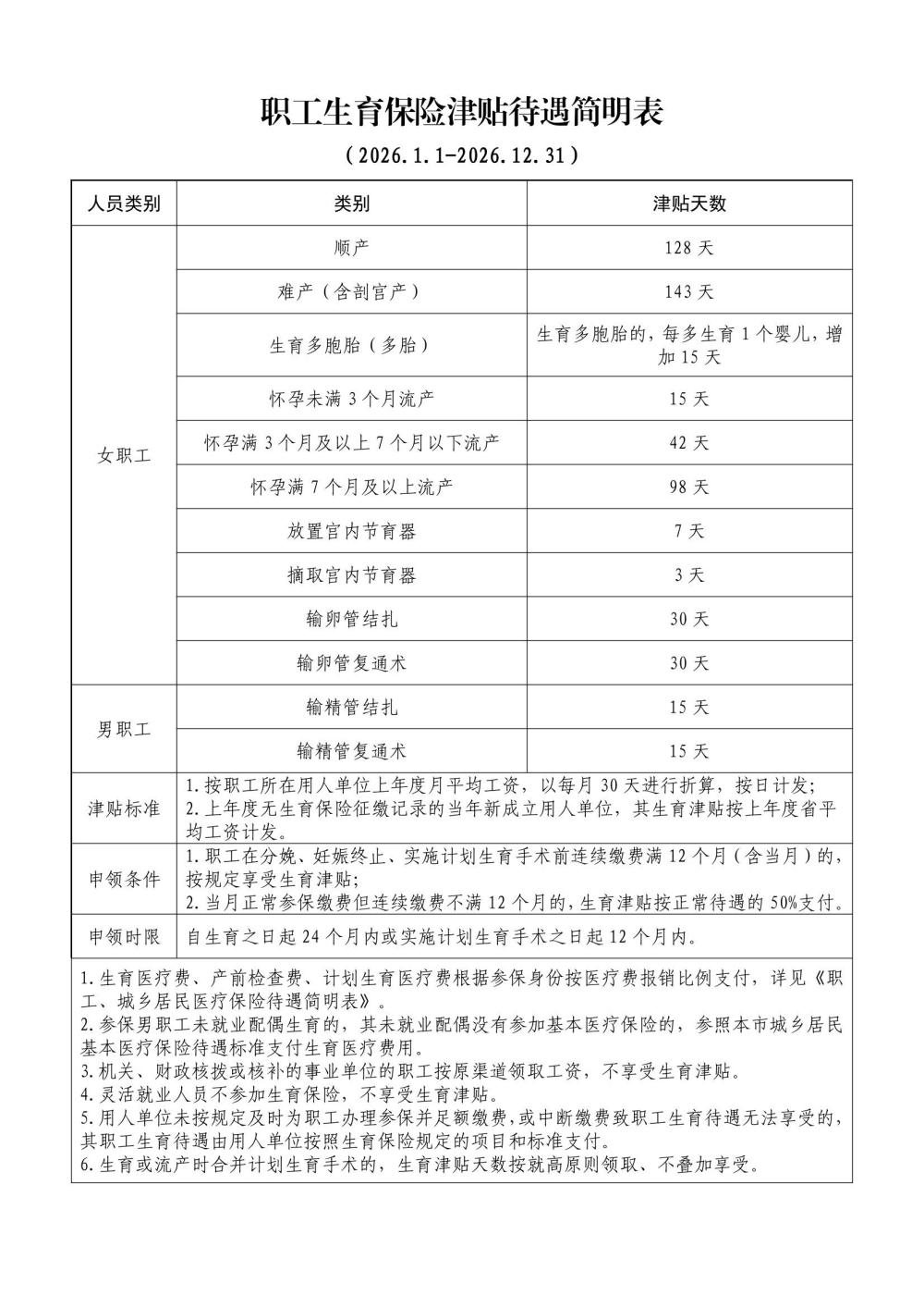 2026年职工生育保险津贴待遇简明表