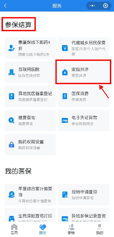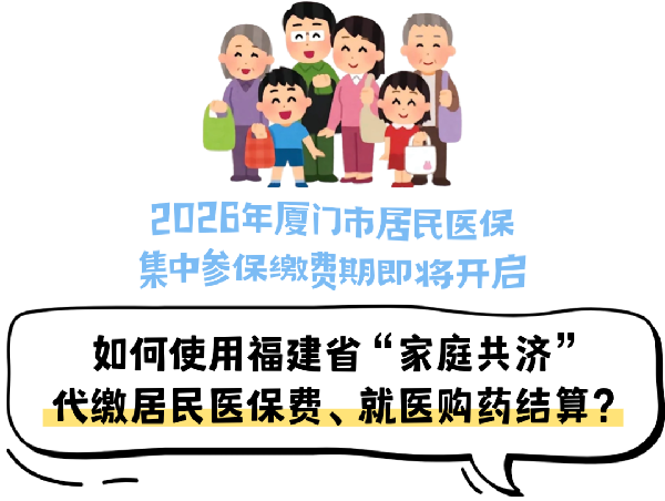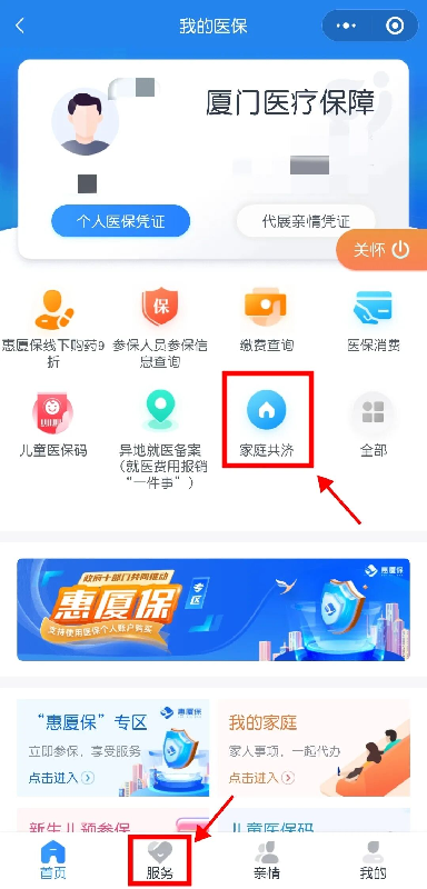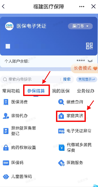 您可登录闽政通APP,点击“医保服务”,或进入“厦门医疗保障”微信小程序“服务”模块,找到“家庭共济”选项。