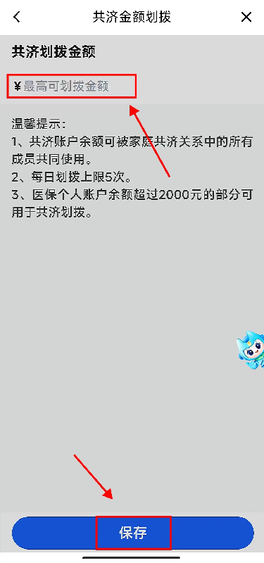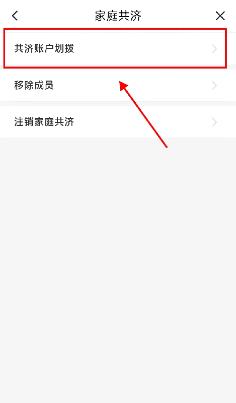 点击办理页面左下角的“管理家庭共济”,并按照图示,点击“共济账户划拨”,在【共济金额划拨】模块中输入需划拨的金额,点击保存即可。