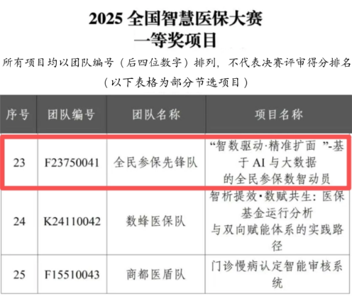 近日,2025全国智慧医保大赛决赛圆满结束,本次大赛吸引1600余支团队报名参与,共有180个项目通过初赛进入决赛评审,经过模拟实操、现场答辩、专家评审等环节,厦门市医疗保障局、国家税务总局厦门市税务局、厦门畅享信息技术有限公司报送的《“智数驱动·精准扩面”-基于AI与大数据的全民参保数智动员》荣获一等奖。