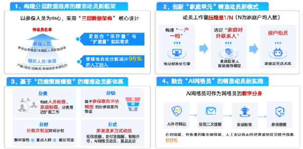 项目创新设计“构建动员底库、制定动员策略、精准参保动员、动员情况监测”四大关键环节,搭建全民参保数智动员系统。依托大数据技术优势,多源融合、动态更新构建城市参保人口底库,实现参保扩面工作从对象、过程到手段、决策的全维度升级——达成“对象精准化、过程精细化、手段智能化、决策科学化”的工作成效。
