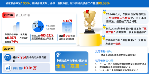 2024年2月,厦门市医保局依托“厦门网格通”搭建上线“全民医保”相关应用,覆盖全市45个镇(街道)、551个社区,近7500名网格员,服务率达100%。自系统上线以来,显著提升了厦门市全民参保工作的效率和精准度。根据统计数据显示,2024年,厦门市基本医疗保险参保人数达483.83万,较上年增长约10.91万人,参保完成率达到了101.5%,超额完成省级下达的参保目标。2025年,厦门市在参保目标值较上年度提高6.55万,占全省扩面增量74%的背景下提前5个月完成省定参保目标值,这一成绩充分展现该项目有效推动了参保扩面提质增效。
